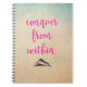 Un carnet en spirale avec une citation motivante inspirée par la force sur la détermination. Conçu pour élever et encourager qui dit : "conquérir de l'intérieur". Écrit dans un rose chaud ceinturé. Un croquis noir d'un sommet de montagne illustré sous la citation pour signifier le voyage, la lutte et l'accomplissement ultime de réaliser ses triomphes personnels.