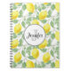 Un carnet en spirale personnalisé avec une initiale monogramme et un nom à l'intérieur d'un cercle blanc avec une bordure en corde noire. Conçu avec des citrons jaunes et des feuilles verts, dans un motif extensible.