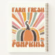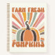 Ce design d'automne dynamique et d'inspiration rétro met en évidence l'expression "Citrouilles frais de ferme" en typographie audacieuse et ludique qui attire immédiatement l'attention. Au centre du design se trouve une grande citrouille stylisée, dans des tons chauds d'automne, orange, brun et crème. La citrouille est encadrée par une explosion dynamique de rayons colorés qui s'étend vers l'extérieur, avec une palette d'oranges mutues, de roses, de jaunes et de verts qui ajoutent une touche nostalgique et vintage au design. La combinaison du motif de sunburst et de la police rond et croustillante donne à l'oeuvre une ambiance amusante et énergique, parfaite pour capturer l'esprit festif de l'automne.
