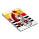 Un design fantaisiste de style rétro avec des souvenirs de vacances espagnoles, une guitare en fer forgé, un ventilateur en dentelle et une rose rouge sur un arrière - plan rayé. Un design personnalisable en noir, blanc, rouge et jaune doré pour que vous personnalisiez avec vos propres textes, images et idées. Une image art numérique originale.
