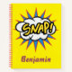 Énergétique et dynamique, ce carnet est doté d'un arrière - plan jaune vif avec "Snap!" écrit en caractères jaunes gras, encadré en noir. Il y a un nuage blanc avec un éclat bleu et rouge derrière. Votre nom est écrit en police de brosse violet. Commandez les vôtres dès aujourd'hui ! Clipart : AnneIllustration https://www.etsy.com/shop/AnneIllustration