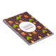 Un carnet en spirale avec un motif amusant sur le thème du camping. Placer sur un arrière - plan brun rougeâtre. Les éléments du motif comprennent un feu de camp, une tente, une guitare, une pelle et un sac à dos.