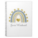 Un simple cahier personnalisé bleu de style bohème arc-en-ciel entouré de cœurs métalliques dorés pour personne ou école. Personnalisez avec votre nom dans un type de script fantaisiste.