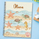 Ce cahier personnalisé présente des créatures marines bébé adorables - étoiles de mer, tortues et hippocampes - sur fond de motifs de vagues douces et de sable fin. Ce design ludique présente des bleus pastel apaisants, des tons de sable chauds et des accents de corail.