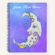 Ce carnet en spirale a un croissant de lune coloré avec un visage décoré de triangles, des cercles en bleu et jaune et un rouleau violet avec des étoiles sur un ciel arrière - plan de bleus et de violets. Customisez votre texte sur le devant avec le modèle.