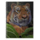 Un tigre rayé orange croupe parmi les plantes de la jungle verte, traquant sa proie avec soin.