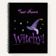 Le design casquette de sorcière Halloween violet noir de Linda Baysinger Peck, avec le texte "Witchy", une araignée orange et des étoiles.