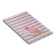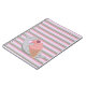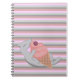 Adorable happy kitty eating pink ice cream with pink and gray striped background.