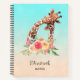 Un carnet personnalisé avec un joli dessin en aquarelles d'une maman et d'une petite girafe. La girafe mère se repose la tête au-dessus de la petite girafe, aimante et adorable. Joli bouquet de fleurs d'aquarelle rose, jaune, vert placé sous cette paire de chatons. Un arrière - plan dégradé de bleu turquoise délicat qui se fond dans une couleur sable brun.