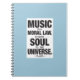 Platon, le philosophe du grec ancien était l'étudiant à Socrates et le professeur à Aristote. La majeure partie de sa vie a été reconstruite par ses écritures. Tandis que je personnellement ne sais pas quand cette citation a été dite, bon nombre d'entre nous peuvent rapporter à la façon dont la musique peut nous inspirer. Nous l'avons laissée nous porter hors de nos mauvais modes et coupures de coeur. Nous l'avons laissé nous aider à créer des histoires dans notre tête ou à soulager l'ennui. Ce carnet pourrait être utilisé pour n'importe quoi, y compris (mais ne pas être limité) l'écriture de chanson et le dire d'histoire. Ouvrez les portes au monde de la musique et de l'imagination. Note : Merci à bestquotes.com pour m'aider à trouver ces citation et biography.com très inspirés pour m'aider pour trouver l'information de fond sur Platon.