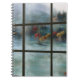 Un petit matin, un paysage d'automne froid regardé par une fenêtre gelée. Les sapins et les pins avec la glace qui blanchit leurs aiguilles, les érables dans les tons de rouge, orange et jaune, herbe blanchie au gel vue à travers le brouillard s'élevant d'un ruisseau caché. Les feuilles roses rouges et verts sont placés de chaque côté, à côté de la fenêtre.