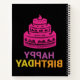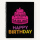 Un cahier élégant à reliure spirale avec une couverture noire présente un graphique vibrant de gâteau d'anniversaire rose et un texte gras en dégradé «Joyeux Anniversaire». Idéal pour les cadeaux, la journalisation et les célébrations festives.