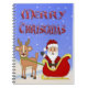 Le carnet de notes à spirale de Père Noël de Joyeux Noël comporte un arrière - plan de scène de neige avec la neige en baisse, Père Noël heureux dans son traîneau avec un renne. Le texte stylisé rouge est Joyeux Noël. Cadeau parfait pour Noël ! Taille : 6,5" x 8,75" 80 noirs et blanc a rayé des pages