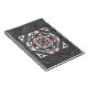 Un mandala carré concentrique prend l'apparence d'un tunnel qui attire le spectateur avec une combinaison de lignes angulaires, de triangles et de cercles dans les tons gris, rouge et blanc pour presque créer une illusion d'optique.