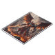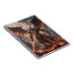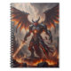 Cette image captivante présente une figure démoniaque puissante debout dans un paysage enflammé. La figure présente de grandes ailes ressemblant à des chauves-souris englouties dans les flammes et est revêtue d'armure foncée et pointue. Ses yeux rouges brillants et son expression menaçante, avec de grandes cornes incurvées, ajoutent à sa formidable présence. Tenant une épée flamboyante dans sa main droite, le démon échappe au pouvoir, avec sa poitrine brillante comme alimentée par un feu interne. L'arrière - plan dramatique d'un ciel orageux, de la foudre et de bâtiments de style gothique renforce l'atmosphère intense et épique de la scène, faisant de cette oeuvre une représentation frappante d'une créature mythique dans un moment de domination.
