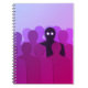carnet éffrayant avec une illustration géométrique conceptuelle d'un fantôme et d'une ombre comme une figure humaine dans une foule de gens. La personne différente est une figure noire foncée avec des yeux brillants. Il se démarque de la foule, qui se compose de formes humanoïdes violettes foncées. Bien que seul, le différent est heureux d'être un bizarre.