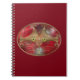 Un visage de chat stylisé fait de courbes et de courbes dorées, avec de grands yeux vert-or, contre un arrière - plan fractal rouge.
