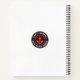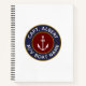 Capitaine personnalisée avec votre nom et nom de bateau ancre nautique logo carnet spiral. Emblème de cercle classique bleu marine et marron avec ancre blanche. texte et or bordures sur un arrière - plan blanc.