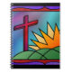 Un design en vitrail illustrant le matin de Pâques, avec une croix rouge sur des collines verdoyantes au bord d'un lever de soleil enflammé.