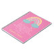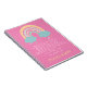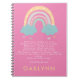 Un carnet délicieux pour une petite fille, avec le verset populaire de la Bible Philippiens 4:8 en blanc, et l'illustration pastel de l'arc-en-ciel avec des nuages et des coeurs, en jaune moutarde, turquoise et lilas, sur un arrière - plan rose. Personnalisez avec le nom de l'enfant en jaune moutarde.