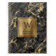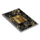 Un carnet élégant avec une image arrière - plan de marbre noir aux veines dorées. Personnalisez-le avec votre initiale monogramme en police décorative et votre nom en lettres compactes sur un carré en feuille d'or brossé.