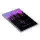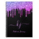 Elégant, moderne rose pourpre Parties scintillant Drips 2 Monogrammes Script sur noir personnalisé nom carnet monogrammed. Doté d'un cadre de goutte à goutte de parties scintillant, grande police de script monogramme à double main avec des swashes (initiales de grande taille), et un nom complet en violet rose sur arrière - plan noir. Facile à personnaliser. Grand cadeau féminin féminin pour petite amie, mère, anniversaire, mariage, douche nuptiale, fête et baby shower doux de 16 ans, affaires, bureau à domicile, travail professionnel et pour toute personne qui aime les jolies choses glam.