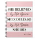 Un chrétien typographique prend une citation de motivation populaire "elle croyait qu'elle pouvait" en rose et chocolat, dans un mélange de serif et de caractères de script. Personnalisez avec votre nom dans le coin inférieur droit.