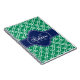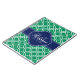 Motif en treillis marocain vert émeraude et blanc avec une initiale en monogramme marine. Au-dessus du motif de treillis vert et blanc se trouve un étiquette bleu marine et blanc avec une lettre monogramme et un modèle de nom pour vous de customiser.