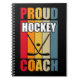 Carnet de l'entraîneur de hockey avec rondelle de hockey et bâtons avec bandes colorées et texte qui dit Proud Hockey Coach.