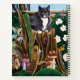 Chat tom gris perché sur une maison de fée faite d'une souche d'arbre. Fée jouant une flûte et une souris à l'extérieur du tricot dans sa chaise, tout autour du chat.