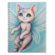 This notebook features a cute, detailed illustration of a fantasy kitten with pastel-colored fur and large, iridescent teal butterfly wings, floating against a light blue, starry background.