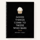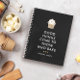 Carnet de recettes chic en parties scintillant noir et blanc et faux or avec "les bonnes choses viennent à ceux qui font la cuisson" écrit sur la couverture dans une police moderne sous un cupcake blanc avec glaçage décoré de petits coeurs dorés. Personnalisez avec votre nom.
