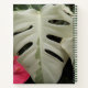 Cahier de taille standard, relié en spirale, avec une photo d'une feuille de Monstera principalement blanche et panachée, accompagnée d'une fleur de Laceleaf rose contrastante. L'image est imprimée sur les deux faces du cahier. Un beau motif floral ! Sélectionnez vos options de style de cahier.