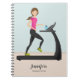 L'illustration de Destei d'une jeune brune mignonne qui court sur un tapis roulant. La fille a des cheveux longs bruns qui est sur une queue de cheval, elle porte une chemise rose, des leggings noirs et des baskets verts. Le tapis de course est noir et il y a une bouteille d'eau bleue dessus. Il y a aussi des zones de texte personnalisables pour le titre.