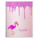 Un arrière - plan métallique à l'apparence d'or rose. La fausse parties scintillant violette dérive comme décoration et un joli flamant rose chaud. Personnalisez et ajoutez votre nom. Le nom est écrit avec un grand script de style moderne écrit à la main. Lettres violettes. Pour que les swashes ne suppriment que le nom de l'échantillon, laissez les espaces ou les émoticônes devant et après le nom