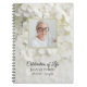 Les invités Invitations à laisser une note en souvenir de votre être cher après leur passage avec l'élégant livre d'hôtes White Hydrangea Flowers Celebration of Life Funeral Flowers. Ce carnet d'hommage à la mémoire fleurie et à l'élégance personnalisée est orné d'une photo florale rapprochée de pétales de fleurs d'hydrangée blanche. Personnalisez-le avec la date de naissance et de décès, le nom et l'image.