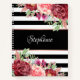 Ce carnet personnalisé présente un design floral moderne avec des fleurs bordeaux et rousses d'aquarelle et du feuillage sur un arrière - plan rayé noir et faux rose en feuille d'or. Le dos a un motif floral assorti. Personnalisez le monogramme avec votre nom ou vos initiales.
