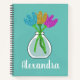 Ajoutez votre nom à ce joli carnet de croquis mignon pour en faire votre propre carnet. Trois fleurs en bleu, or et rose avec un effet parties scintillant dans un vase à l'eau sont présentées dans le design.
