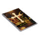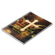 Grande croix dorée avec casquette de jester et couronne dorée avec design typographique.