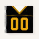 Ce design est un maillot de style football / crosse en noir avec garniture de collier or, la couleur "peau" arrière - plan peut être changée, il suffit de cliquer PERSONNALISER. carnet en spirale de 8,5 po x 8,5 po avec couvertures laminées, et un choix de style papier, y compris le carnet de croquis, gouverné, demi-régi, graphique. L'avant et l'arrière des carnets ont des modèles de jersey personnalisables, vous permettant d'ajouter votre nom et numéro de choix à l'arrière, et le numéro à l'avant, utilisez les cases à droite de l'image pour modifier le texte. Vous pouvez également ajouter un logo ou votre propre texte à l'avant, il suffit de cliquer sur la PERSONNALISER. Ces carnets sont parfaits pour l'esquisse, la création de listes, la tenue de recettes, la conservation de vos statistiques sportives, et idéal comme retour aux cadeaux scolaires pour les élèves. Cadeaux de maillot de sport personnalisés uniques pour les amateurs de sport et les joueurs de votre vie!