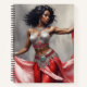 Una acuarela que captura la esencia de la danza del vientre. La bailarina de piel oscura resplandece con un traje rojo y plateado que refleja su pasión y sofisticación.