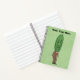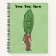 This spiral notebook has a fun man in a brown suit with red tie with a big green pickle for a head that has a surprised looking face on a green background. Customise your text on the front with the template.