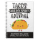 Carnet humoristique amusant pour les amateurs de taco, avec la légende "Tacos are my spirit Animal" en typographie moderne noire avec une jolie illustration d'un joli taco souriant. Ce carnet comporte deux lignes de texte personnalisable, facilement personnalisable avec votre nom et les détails optionnels. Pour des demandes personnalisées, d'autres personnalisations ou des combinaisons de couleurs, n'hésitez pas à me contacter à l'adresse zolicestore@hotmail.com