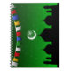 Illustration colorée avec une guirlande festive dans une scène de nuit magique avec une silhouette de mosquée et la lune et étoiles sur un ciel de nuit vert.