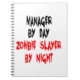 Ce design de texte avec la citation "Manager by Day Zombie Slayer by Night" dans l'écriture rouge sang est parfait pour tout gestionnaire qui aime les zombies.