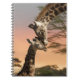 Une girafe adulte salue une girafe de bébé contre le contexte d'un coucher du soleil africain.