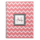 Carnet en spirale motif de chevron blanc et pastel avec un nom en noir et monogramme dans l'ombre rouge assortie.