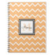 Carnet en spirale motif de chevron blanc et pastel avec un nom en noir et monogramme dans l'ombre orange assortie.
