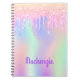 Un arrière - plan tendance aux couleurs irisées avec des couleurs pastel unicorne et arc-en-ciel rose, violet, or rose, vert menthe. Décoré avec des gouttes de parties scintillant en or rose, rose et violet. Personnalisez et ajoutez un nom, écrit avec un script de style à la main girly moderne. Lettres violettes.