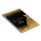 A beautiful gold themed elegant watercolor dress gown on a black background with faux glitter at the top and bottom of the guest book.
